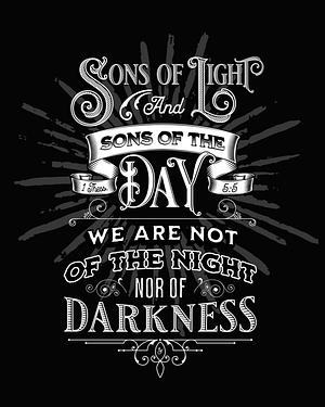 This design features a portion of 1 Thessalonians 5:5 "sons of light and sons of the day. We are not of the night nor of darkness". The illustration is white in color with a Victorian hand lettering style. © Zoe White Design